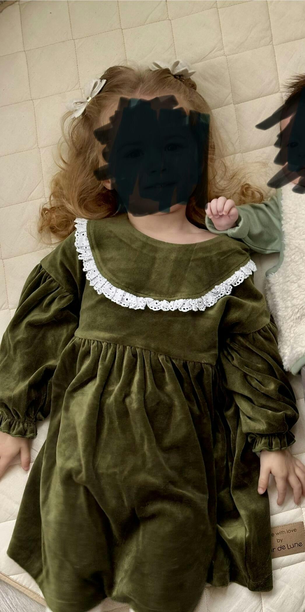 Dress – Soft velvet dress in a rich bronze green shade, with a round neckline finished with a delicate lace frill. Features a gathered waistline for volume, drop shoulders, and elasticated cuffs for a sweet puff-sleeve effect. A back placket with contrast buttons makes dressing quick and easy.